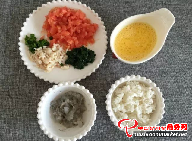 番茄1个、白玉菇20克、菠菜3棵、虾仁5个、鸡蛋1个、米饭适量、淀粉适量、葱适量、油适量