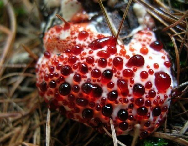 你很容易注意到有亮红色的液体从出血齿菌的细孔渗出,这可能会让你以为自己身处植物园谋杀案现场。出血齿菌也被叫做“魔鬼的牙齿”或“草莓奶油”。它们无毒,但味道很苦,这是为了吓退包括人在内的掠食者。只有年轻的出血齿菌才会“出血”。检测发现,这种“血”中包含一种抗凝剂,显示出与天然有机抗凝血因子肝素(用于防治血栓形成等)相似的特性。虽然出血齿菌的子实体(高等真菌的产孢构造,即果实体,由已组织化了的菌丝体组成)在年轻时容易辨别,但随着衰老,它们会变成难以名状的棕色。