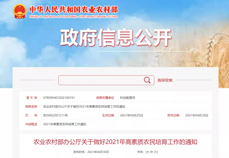 农业农村部办公厅关于做好2021年高素质农民培育工作的通知
